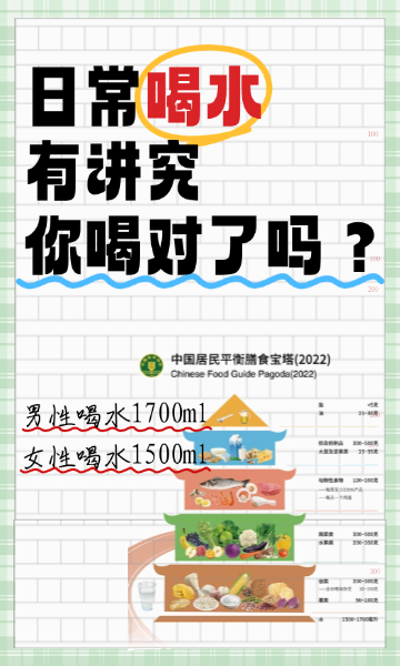 2022版《中国居民膳食指南》的建议:足量饮水,少量多次。在温和气候条件下,低身体活动水平成年男性每天喝水1700ml,成年女性每天喝水1500ml。推荐喝白水或茶水,少喝或不喝含糖饮料,不用饮料代替白水。