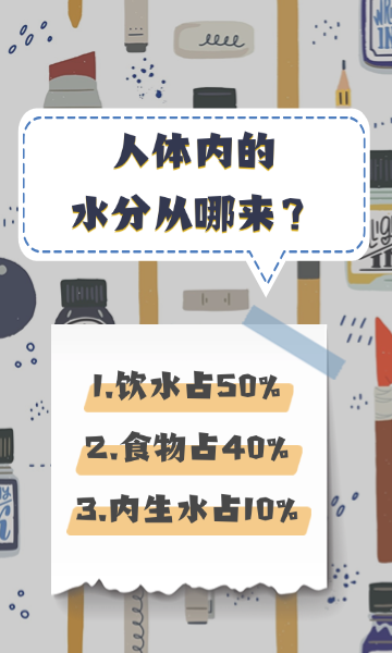 人体内的水有3个来源:饮水、食物水以及内生水。我国居民通过饮水或饮料等摄入的水分占总水摄入量的50%左右;通过食物摄入的水分占水总摄入量的40%左右;内生水是指蛋白质、脂肪和碳水化合物等营养物质在体内氧化代谢产生的水,约占总水摄入量的10%。
